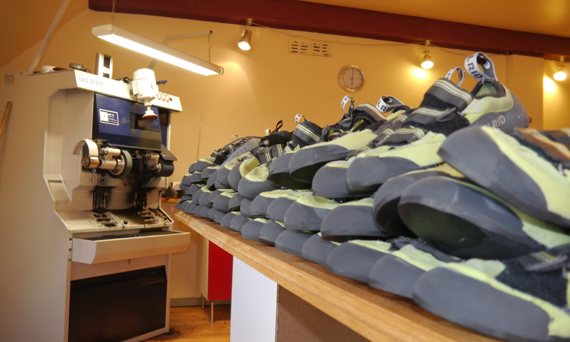 VIBRAM® Material. Neben der hohen Produktqualität bietet diese Marke, für jeden Typ von Sportkletterern, die optimale Sohle an. Schon vor einigen Jahren habe ich mich entschieden ausschließlich Kletterschuhe zu reparieren. Ich mache diese anspruchsvolle Arbeit an den Kletterschuhen wirklich gerne. Meine neue Werkstatt konnte ich genau für die Anforderungen dieser Tätigkeit planen und einrichten. Die Kunden können mich dort besuchen, aber hauptsächlich läuft die Reparatur über den Versand. Das klappt mittlerweile recht gut. Die Pakete mit den Schuhen werden direkt zur Werkstatt geliefert. Dort werden die Aufträge erfasst, bearbeitet und für den Rückversand fertig gemacht. Der DHL-Versand holt die fertigen Pakete täglich bei uns ab. Die Bearbeitungszeit beträgt ca. 1 Woche.